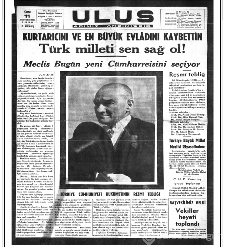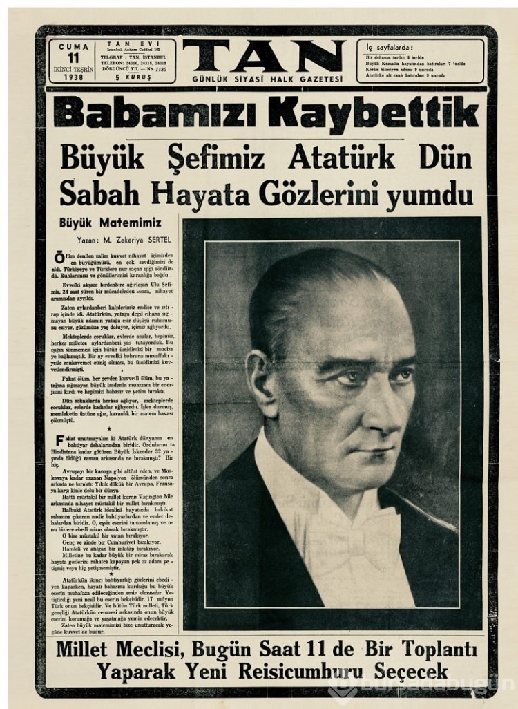 Tan gazetesi 11 Kasım 1938 tarihli sayısında haberi, tam sayfa bastığı Atatürk fotoğrafı üzerindeki "Babamızı kaybettik" manşetiyle duyurdu.
