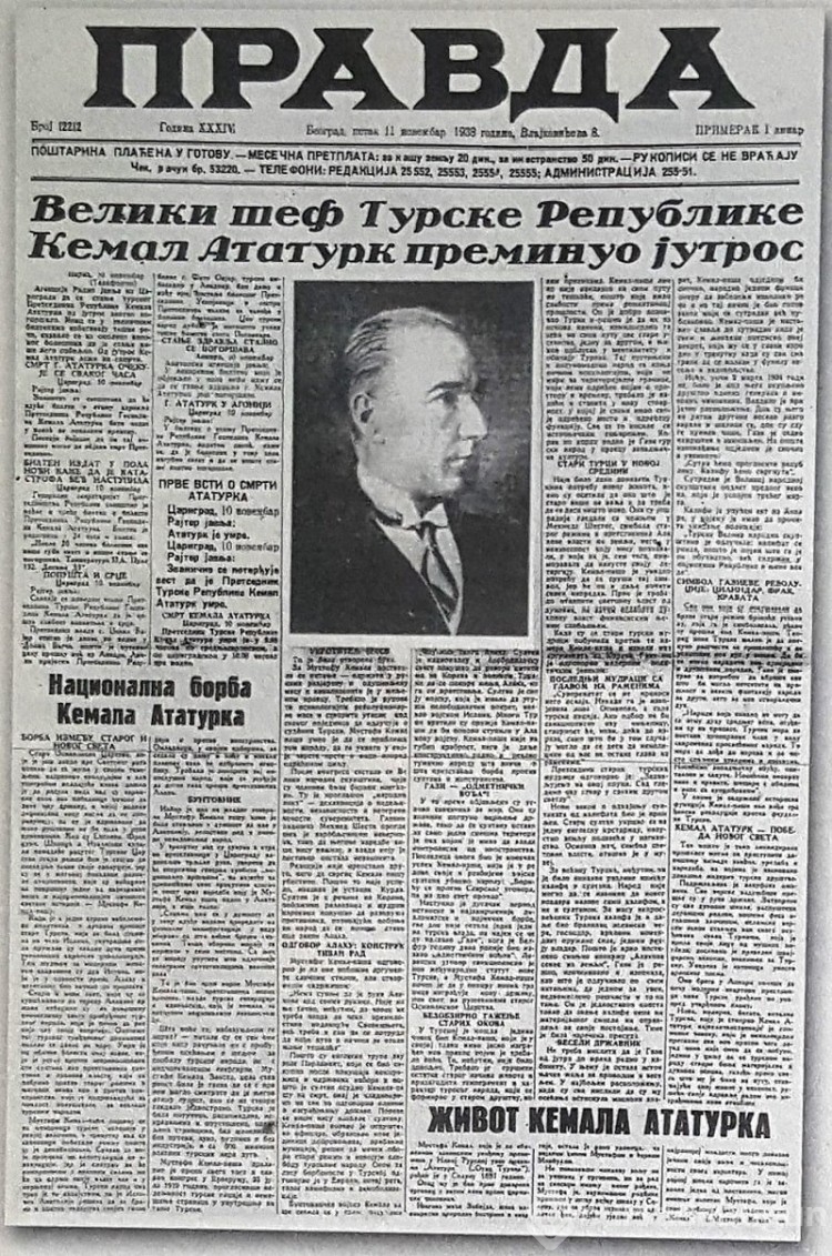 Yugoslavya'nın resmî gazetesi Pravda, tarihi haberi, "Türkiye Cumhuriyet'inin büyük şefi Kemal Atatürk dün sabah vefat etti" başlığıyla duyurdu.