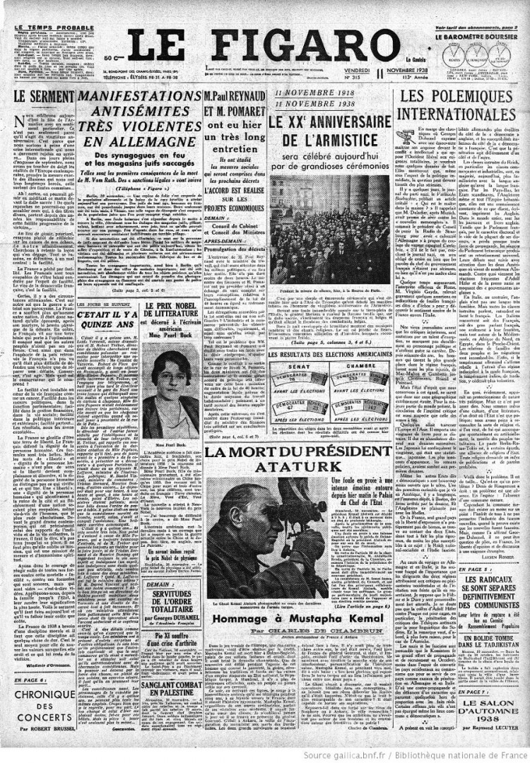 Fransız gazetesi Le Figaro "Cumhurbaşkanı Atatürk'ün vefatı" başlığıyla verdiği haberde, Atatürk'ün 09.05'te vefat ettiğini, "Duygu yüklü kalabalık Dolmabahçe'de toplandı" şeklinde duyurdu.