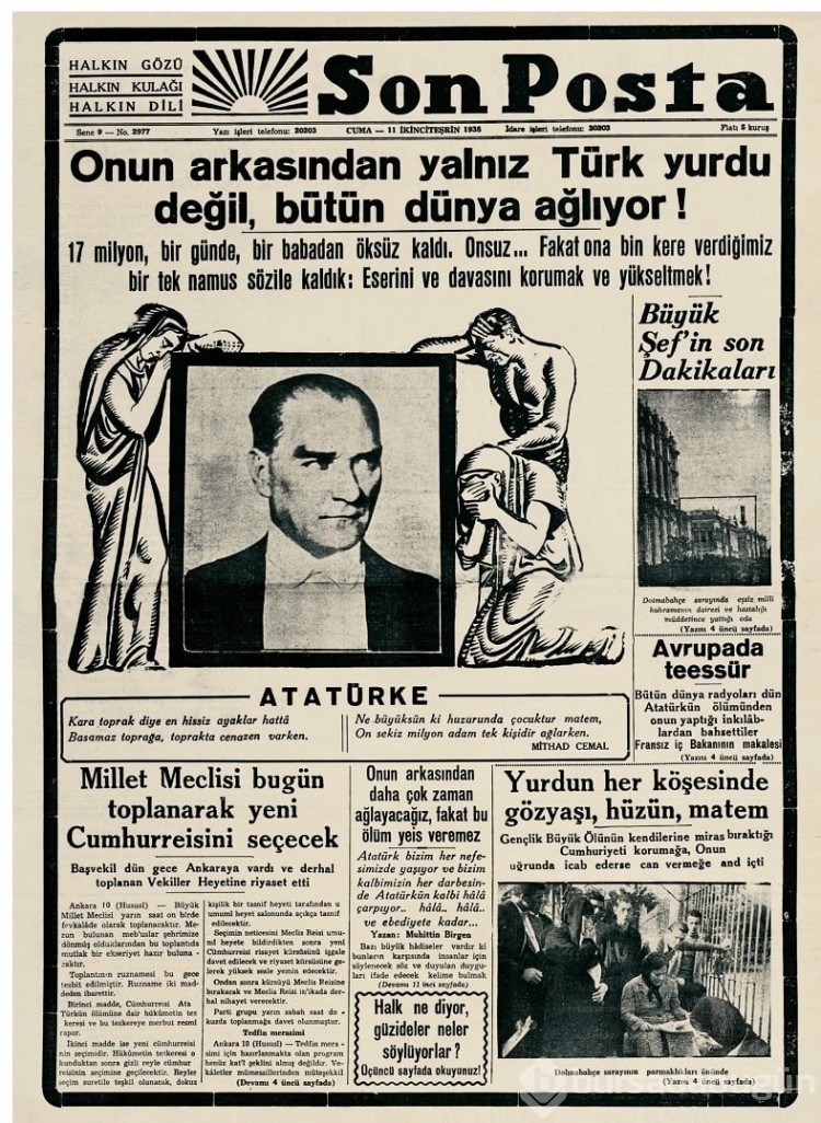 11 Kasım 1938 tarihinde basılan Son Posta gazetesi manşetinde, "Onun arkasından yalnız Türk yurdu değil, bütün dünya ağlıyor!" başlığını kullandı.