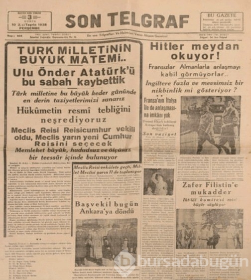 Son Telgraf gazetesi de büyük acıyı 10 Kasım'da yaptığı ikinci baskı ile duyurdu. "Türk Milletinin Büyük Matemi..." başlığıyla verilen haberde, "Ulu Önder Atatürk'ü bu sabah kaybettik. Türk milletine bu büyük keder gününde en derin taziyelerimizi sunarız." ifadeleri yer al.