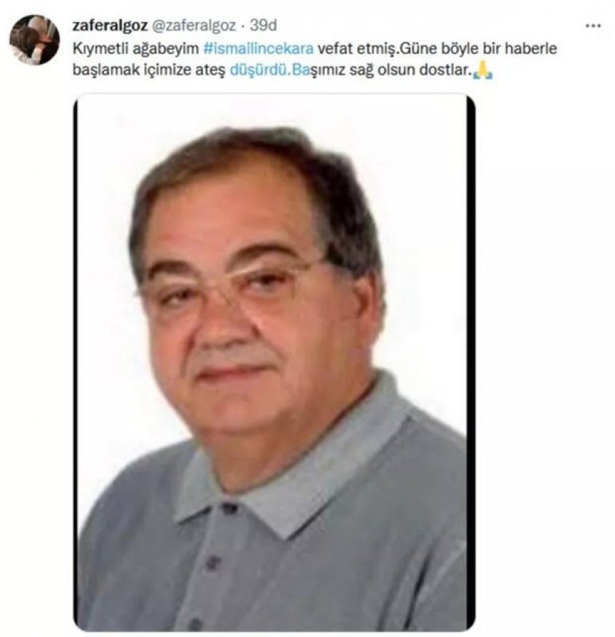 Acı haberi Zafer Algöz, sosyal medya hesabından duyurdu. Algöz, "Kıymetli ağabeyim İsmail İncekara, vefat etmiş. Güne böyle bir haberle başlamak içimize ateş düşürdü. Başımız sağ olsun dostlar" mesajını yayınladı.