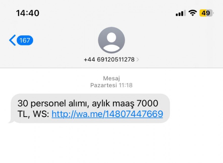 Bu numaraların dışında görmeye alışık olmadığımız bazı numaralardan da vatandaşlara mesajlar geliyor. Dolandırıcılara ait olduğu düşünülen bu numaralardan farklı sebeplerden dolayı mesaj atılabiliyor. Bir vatandaşa gelen "30 personel alımı, aylık maaş 7000 TL" yazan mesaja bir bağlantı linki bırakılıyor. Güvenli olmadığı düşünülen link, dolandırıcılar tarafından bilerek yollanıyor.