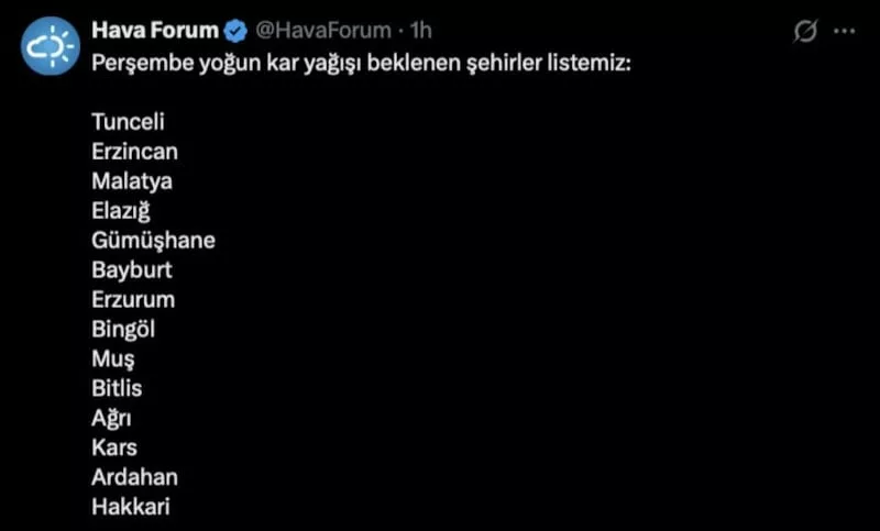 Paylaşımında kar yağışı beklenen illeri tek tek sıraladı. İşte o şehirler: