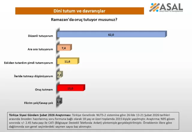 ASAL Araştırma şirketi, Şubat 2026'da 26 ilde 2 bin 15 kişiyle gerçekleştirdiği ankette vatandaşların ibadet alışkanlıklarını ölçtü. Araştırma sonuçlarına göre katılımcıların yüzde 31,2'si düzenli namaz kıldığını ifade ederken, yüzde 62'si Ramazan ayında düzenli olarak oruç tuttuğunu belirtti. Ankette ayrıca yardımlaşma konusundaki eğilimler de dikkat çekti. Katılımcıların yüzde 78,6'sı fitre, zekât veya sadaka verdiğini söyledi.