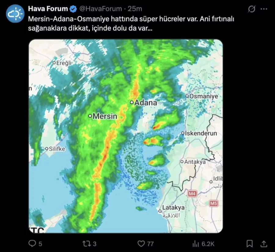 Uyarısında, "Mersin-Adana-Osmaniye hattında süper hücreler var. Ani fırtınalı sağanaklara dikkat, içinde dolu da var..." ifadelerini kullandı.