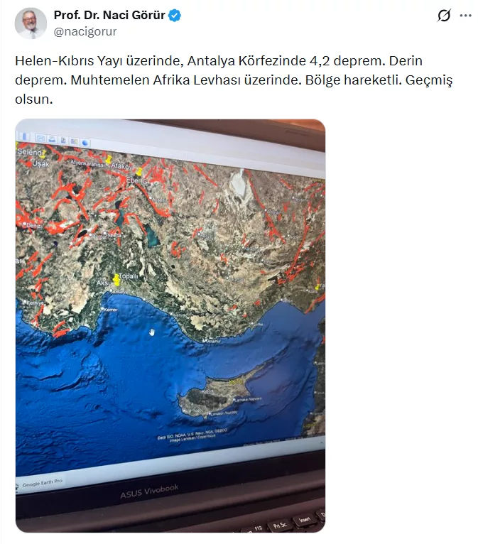 Yer bilimci Prof. Dr. Naci Görür, korkutan depreme ilişkin değerlendirmede bulundu. Görür, depremin Helen‑Kıbrıs Yayı üzerinde ve Antalya Körfezi civarında meydana geldiğini belirterek, "Derin deprem. Muhtemelen Afrika Levhası üzerinde. Bölge hareketli. Geçmiş olsun." ifadelerini kullandı.