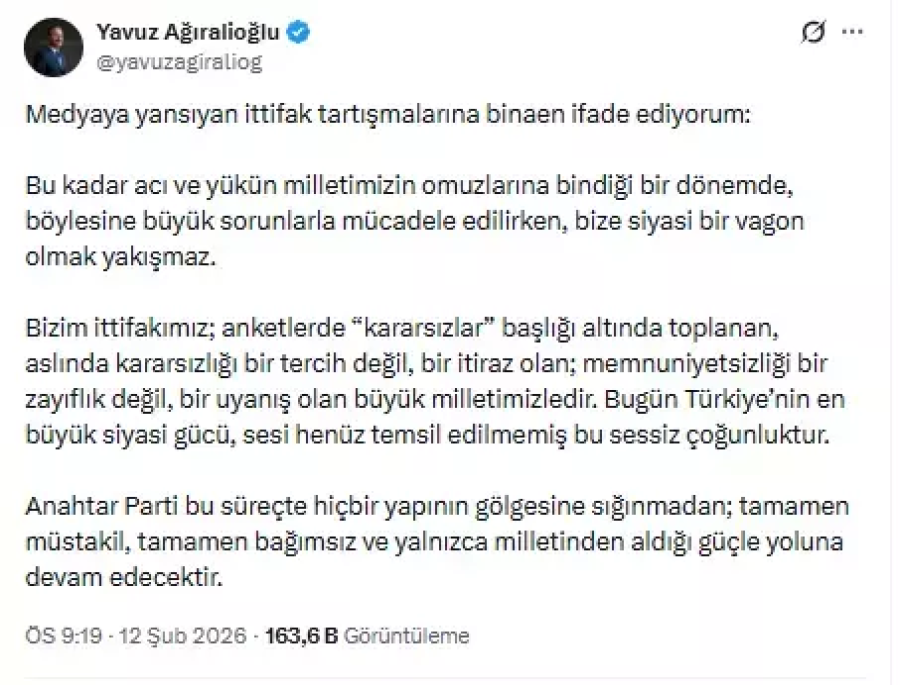 Seçime tek başlarına gireceklerini ifade eden Ağıralioğlu, "Bizim ittifakımız; anketlerde 'kararsızlar' başlığı altında toplanan, aslında kararsızlığı bir tercih değil, bir itiraz olan; memnuniyetsizliği bir zayıflık değil, bir uyanış olan büyük milletimizledir. Bugün Türkiye'nin en büyük siyasi gücü, sesi henüz temsil edilmemiş bu sessiz çoğunluktur. Anahtar Parti bu süreçte hiçbir yapının gölgesine sığınmadan; tamamen müstakil, tamamen bağımsız ve yalnızca milletinden aldığı güçle yoluna devam edecektir." ifadelerini kullandı.