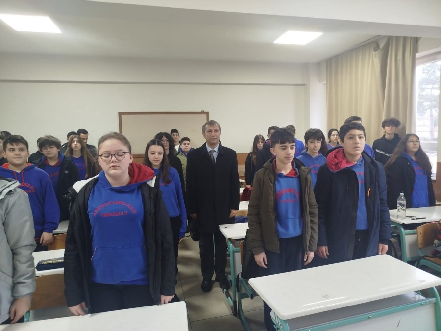 Orhangazi ilçesinde de Anma programına katılan İlçe Millî Eğitim Müdürü Erol Şanlıtürk ile İlçe Millî Eğitim Şube Müdürü Cengiz Tosun, Abdulhamid Han Ortaokulunda öğrencilerle birlikte saygı duruşuna bulundu.