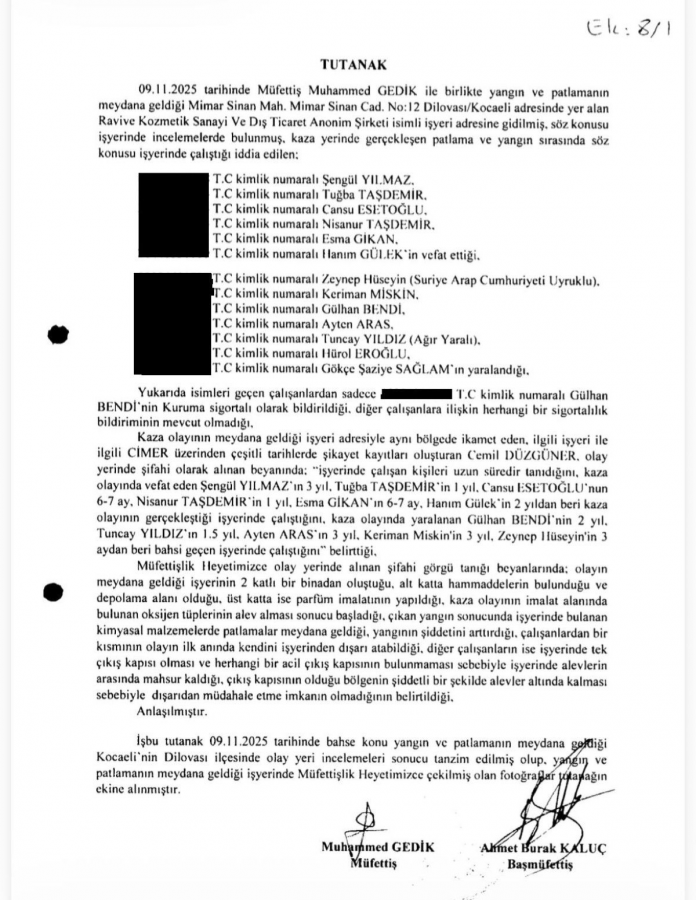 Yangının yetersiz teknik altyapı, bakımsız ekipman ve uygun olmayan üretim koşullarından kaynaklandığı kanaatine varılan raporda; çalışanlar ve vardiya amiri, işverenin belirlediği üretim düzeni içerisinde görev yaptıkları için olayda kusurlu görülmedi. Öte yandan raporda; yangında hayatını kaybeden 7 kişiye ilişkin olay günü herhangi bir sigortalılık bildiriminin mevcut olmadığı belirtildi. Raporda yer alan görgü tanığı beyanlarında ise bazı çalışanların yangının ilk anında dışarı çıkabildiği ancak tek çıkış kapısı ve acil çıkış bulunmaması nedeniyle diğer çalışanların alevlerin sardığı kapıdan çıkamadığı ve içeride mahsur kaldığı belirtildi.