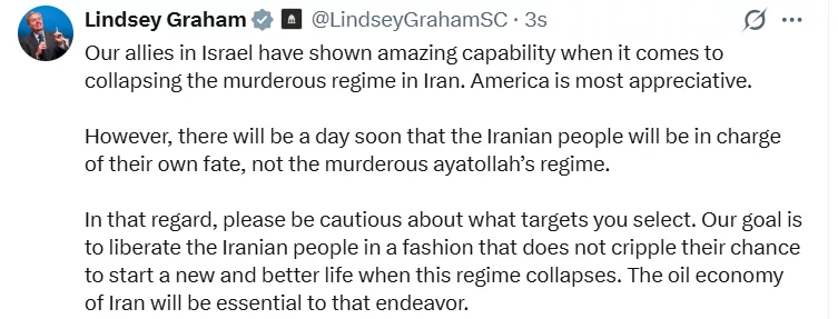ABD ve İsrail'in amacının İran halkını özgürlüğe kavuşturmak olduğunu öne süren Graham, "Bu bağlamda, lütfen seçeceğiniz hedefler konusunda dikkatli olun. Amacımız, İran halkını, bu rejim çöktüğünde yeni ve daha iyi bir hayata başlama şanslarını sekteye uğratmayacak bir şekilde özgürlüğüne kavuşturmaktır. İran'ın petrol ekonomisi bu çaba kapsamında hayati önem taşıyacaktır" ifadelerini kullandı.