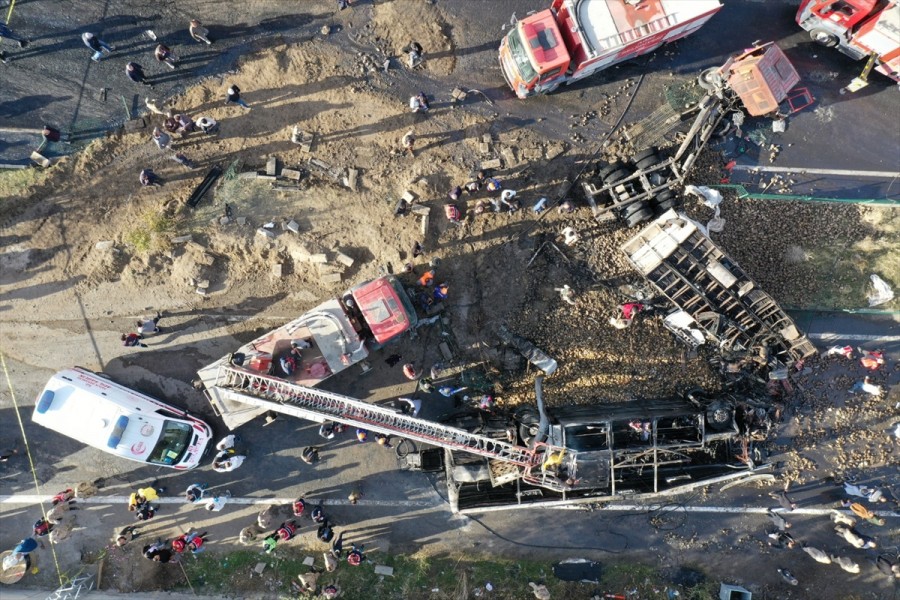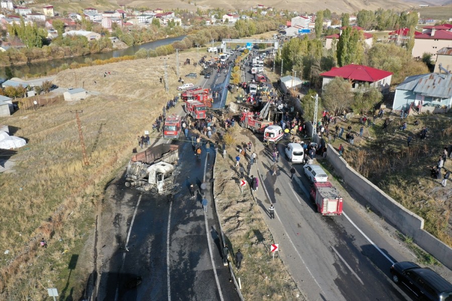 Tutak'ta 2 tır ve 1 yolcu otobüsünün karıştığı ölümlü ve yaralamalı trafik kazasında çarpışma neticesi çıkan yangın, görevlilerin müdahalesiyle söndürüldü. Kazada 7 vatandaş hayatını kaybederken, 2'si ağır olmak üzere toplam 18 kişi yaralandı.