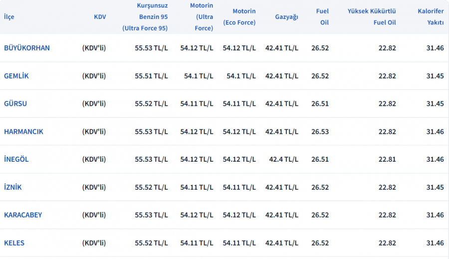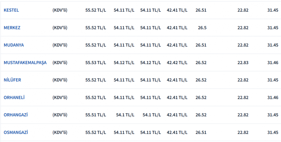 BURSA GÜNCEL AKARYAKIT FİYATLARI