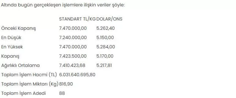 KMKTP'de altında toplam işlem hacmi 6 milyar 31 milyon 640 bin 695,80 lira, işlem miktarı ise 816,90 kilogram oldu.