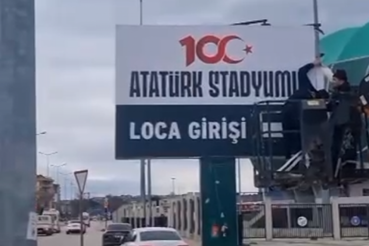 100.Yıl Atatürk Stadı yazısı, yetkililer tarafından vinçler yardımıyla yol tarafındaki stadın giriş bölümüne "loca girişi" ibaresi de eklenerek monte edildi.