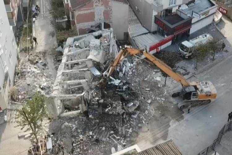 Kocaeli'nin Gebze ilçesinde 4 kişiye mezar olan 7 katlı binanın enkazının kaldırılması için çalışma başlatıldı. Yapılan çalışmalar dronla görüntülendi.