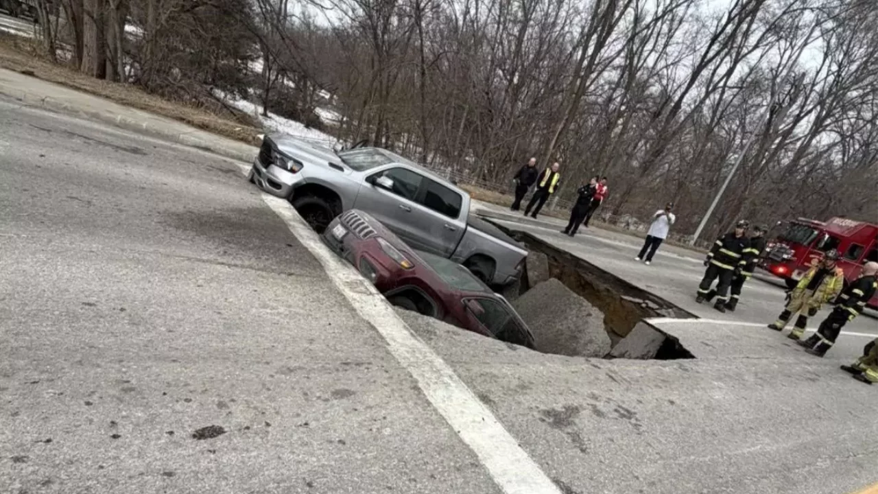 ABD'nin Nebraska eyaletinde kırmızı ışıkta bekleyen iki araç, yolun aniden çökmesiyle oluşan çukura gömüldü.