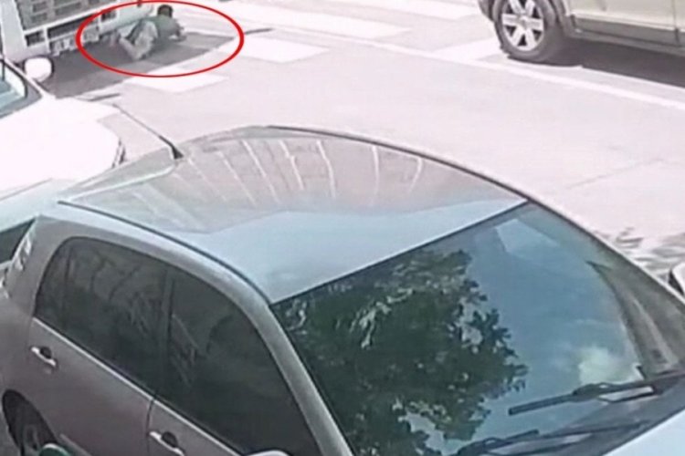 Ahmet'in TIR'ın altında kalma anı ise çevredeki iş yerinin güvenlik kamerası tarafından kaydedildi.