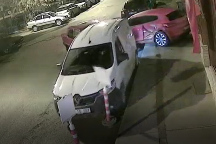 Karabük'te, 0.84 promil alkollü M.E.B.'nin (25) kullandığı otomobil, sokakta park halindeki araçlara çarptı. Kaza anı, çevredeki bir iş yerinin güvenlik kamerasına yansıdı.