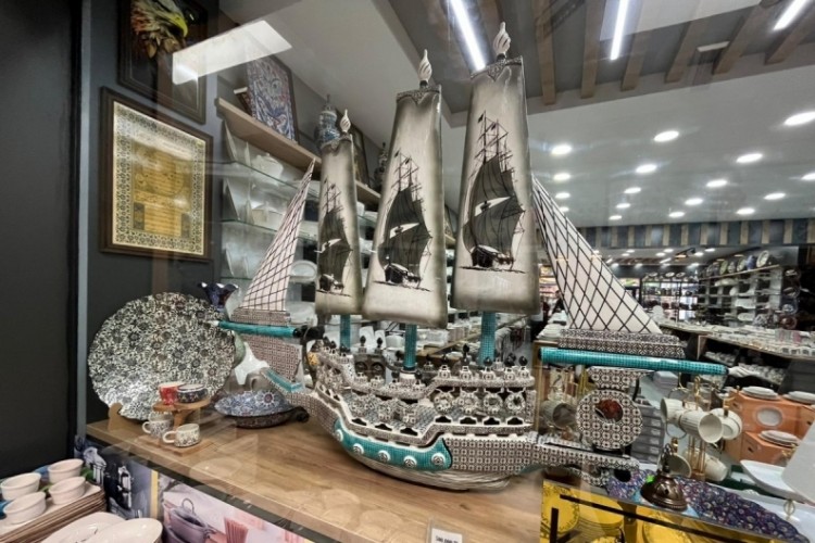 Kütahya Çiniciler Çarşısı'nda bir dükkanda sergilenen el yapımı çini desenli porselen gemi, görenlerin dikkatini çekiyor. Tamamen el işçiliğiyle üretilen ve yapımı yaklaşık altı ay süren özel tasarım geminin, mağazaya kurulumu dahi bir gün sürdü.