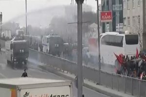 Yürüyüşe izin vermeyen polis, göstericilere tazyikli su ve biber gazıyla müdahale etti.