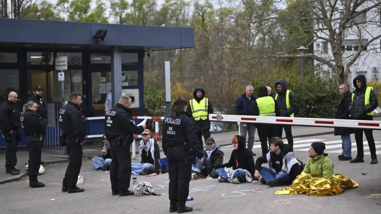 "Soykırıma Karşı Barışçıl Mücadele (Peacefully Against Genocide)" grubu üyesi aktivistler Berlin'in Wedding semtindeki Rheinmetall tesisinin girişinde oturma eylemi yaptı.