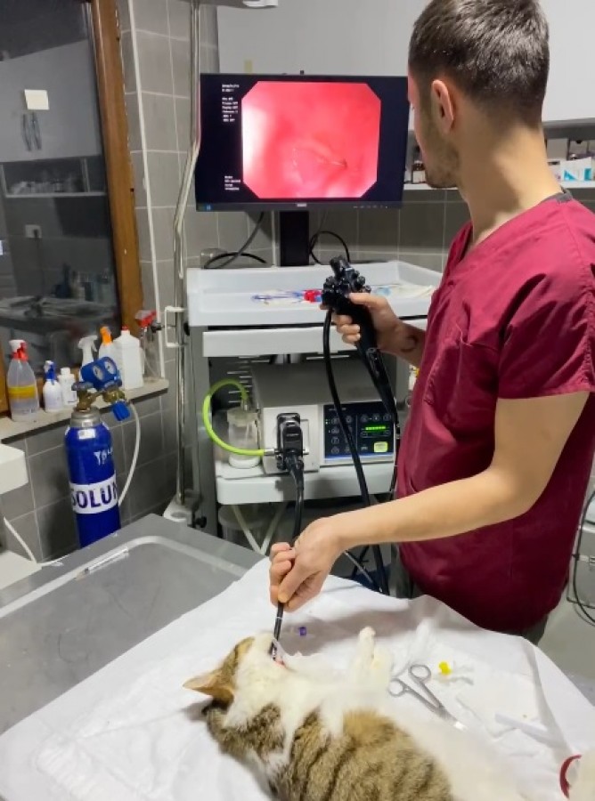 Bilecik'ten yabancı cisim yutma şüphesiyle Osmaneli Belediyesi Hayvan Barınağı ve Hayvan Hastanesi'ne getirilen kedi hemen uyutularak endoskopi yapıldı. Veteriner Sağlık Teknisyeni Bahadır Kaya tarafından endoskopi kapılan kedinin midesinden sindirilemeyen parçalar çıktı. Yapılan operasyon hakkında bilgi veren Kaya, "Kedimiz Bilecik merkezden şiddetli kusma ve yemek yememe şikâyetiyle geldi. Daha sonra Veteriner Hekim Abdullah Tetik bey ile endoskopi yapılmasına karar verdik. Endoskopi sonucunda da sindirilmeyen parçalar ortaya çıktı midesinde. Daha sonra parçaları midesinden endoskopi yoluyla çıkardıktan sonra kedimiz tekrardan yemek yemeye başladı ve şu an sağlığına kavuştu" dedi.