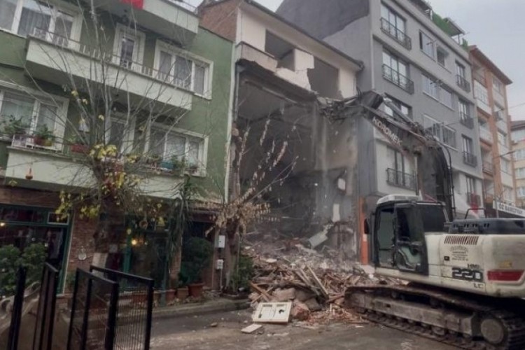 Bursa'da yeni yapı için yıkılacak olan 4 katlı eski bina, iş makinesi tarafından ilginç yöntemle yerle bir edildi. Binanın çatısından başlayacağına, zemininden başlayınca ortalık savaş alanına döndü.