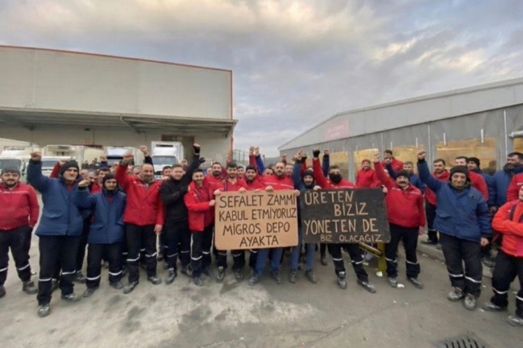 Bursa'daki Migros depolarında çalışan işçiler, teklif edilen yüzde 3 zammı kabul etmedi. "İnsanca yaşam" talebiyle iş bırakan emekçiler, maaşlara net yüzde 50 zam ve vergi yükünün işveren tarafından karşılanmasını istiyor.