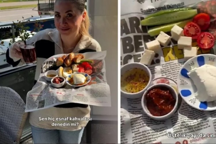 Bursa'da bir işletme, geleneksel esnaf kültürünü modern bir dokunuşla yorumlayarak 'esnaf kahvaltısı' menüsünü gazete kağıdı üzerinde servis etmeye başladı. Peynir, zeytin, domates, salatalık, reçel, bal-kaymak gibi klasik kahvaltılıkların yer aldığı menü 175 TL olarak belirlendi.