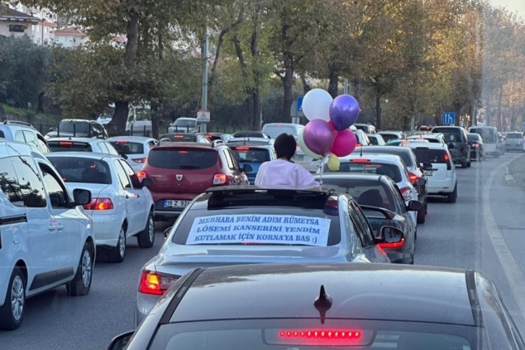 Bursa'da bir genç kız, lösemi kanserini atlatmasının ardından kutlamak için aracının arkasına bir yazı astı. Asılan yazıyı gören diğer sürücüler ise, Rümeysa'nın zorlu mücadelesini yenmesini kutlamak için kornaya basarak mutluluğuna eşlik etti.