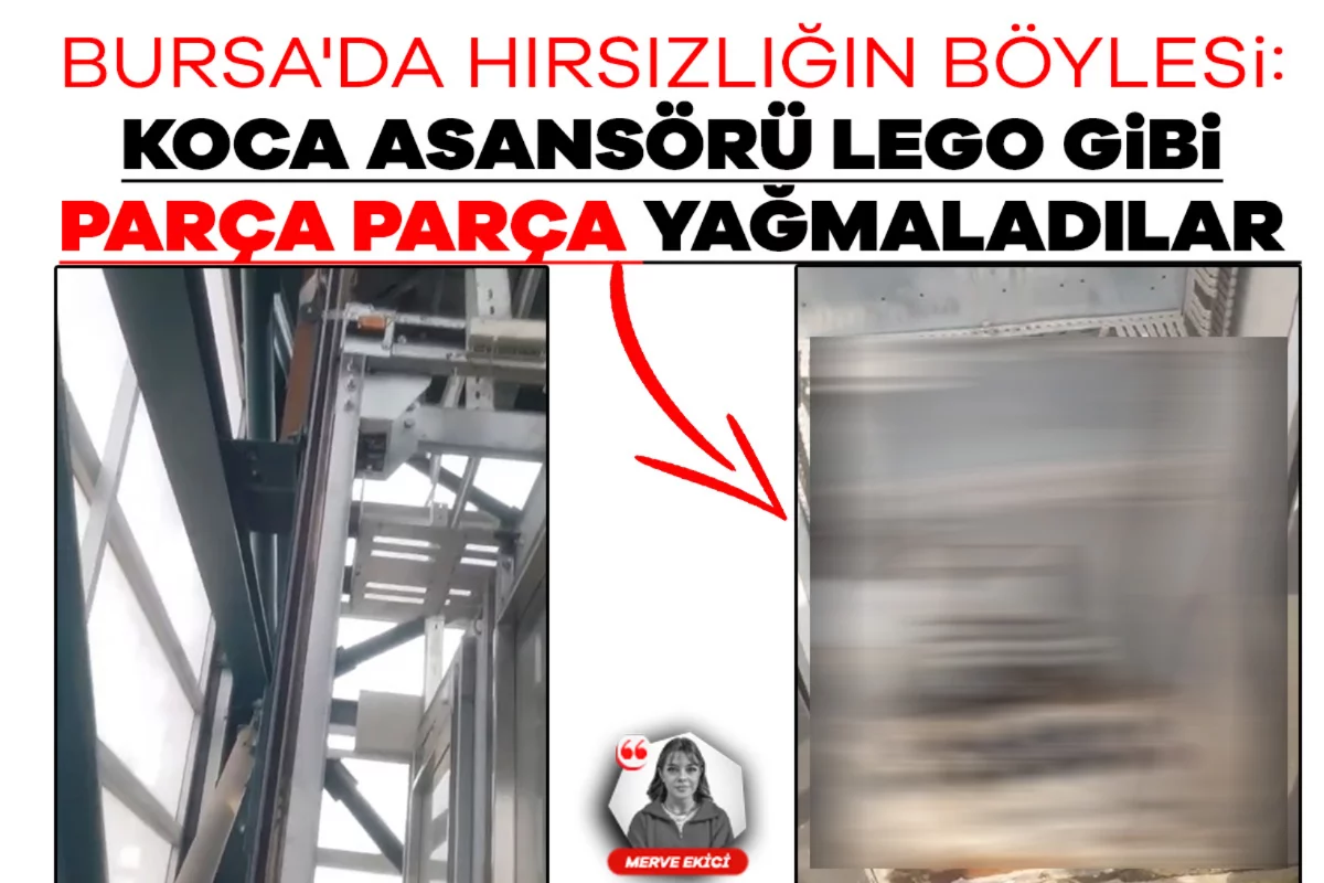 Bursa'da Hurdacılar Sitesi yanında bulunan bir asansörün kimliği belirsiz kişi ya da kişilerce yağmalandı. Edinilen bilgiye göre asansörün kabin ve mekanik aksamları başta olmak üzere tüm parçaları tek tek sökülürken, içeride bulunan bakır kabloların da tamamen çalındığı belirtildi.