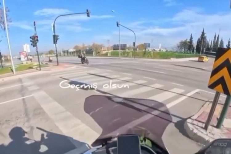 Bursa'da, kırmızı ışığın yandığını son anda fark edip fren yapan sürücünün motosikletine arkasından gelen motosiklet çarptı. İki sürücünün yaralandığı kaza, bir başka motosiklet sürücüsünün kask kamerasına yansıdı.