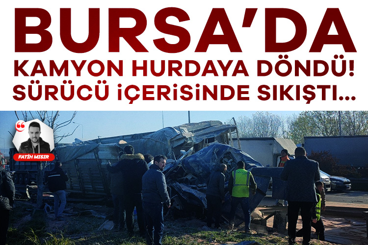 Bursa'da, çevre yolu üzerinde meydana gelen trafik kazasında kontrolden çıkan kamyon dinlenme tesisi önünde bariyerlere girdi. Kazada, hurdaya dönen kamyonun şoförü kabin içinde sıkıştı.