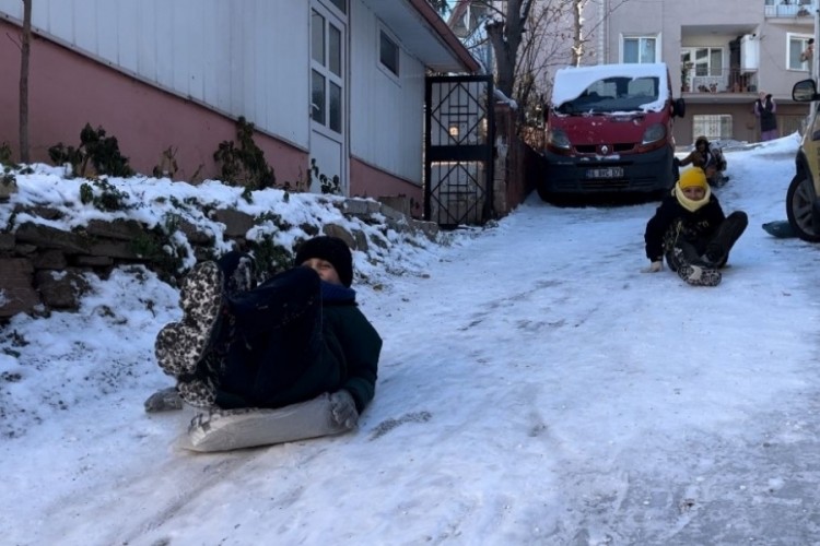 Kentte dün etkisini artıran kar yağışı sonrası buzlanma ve don riski nedeniyle Bursa Valiliği, eğitime bir gün ara verildiğini açıkladı. Okulların tatil edilmesini fırsat bilen çocuklar, ailelerinin gözetiminde sokaklara çıktı. Bazı çocuklar, içine yastık koydukları naylon poşetlerle buzlanan yolda, yokuş aşağı kayarak eğlenirken, bazıları ise babalarının kucağına oturarak kaydı.