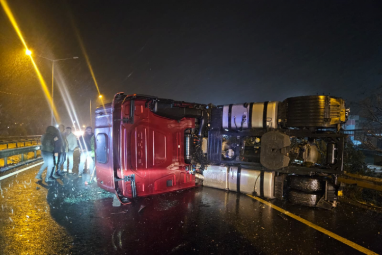Alınan bilgilere göre Orhangazi yönüne gitmekte olan sürücüsünü kimliği belirlenemeyen çekici, yağışlı havada kontrolden çıkarak bariyerlere çarptı ve ardından devrildi.