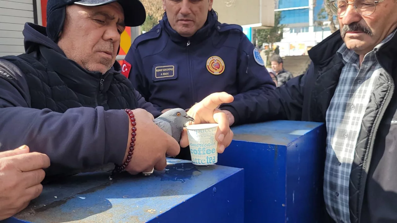 Aşağıya indirilen güvercine ekipler tarafından su verildi ve sonrasında doğaya salındı.