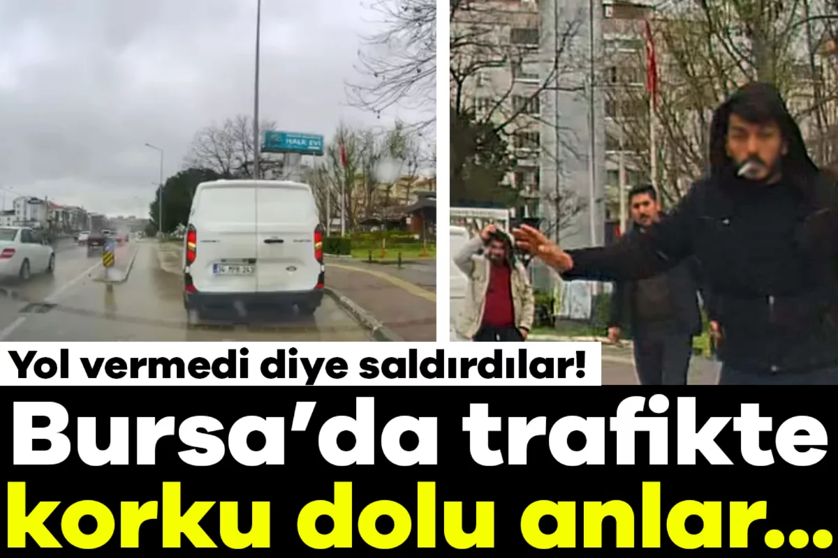 Bursa'da trafikte yol verme tartışması nedeniyle minibüsten inen 3 kişi, otomobil sürücüsüne saldırdı. O anlar otomobilin araç kamerasına yansıdı.