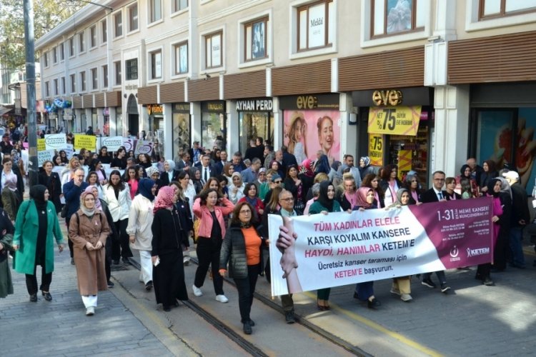Bursa Büyükşehir Belediyesi Bandosu'nun marşlarıyla eşlik ettiği yürüyüşe katılan kadınlar, "Tüm kadınlar el ele, karşı koyalım kansere, haydi hanımlar KETEM'e", "Farkın farkındalığın olsun, sevdiklerin mutlu olsun" ve "Bayanlar sağlığınız parmağınızın ucunda" yazılı pankartlar, meme kanserinin simgesi olan dev "pembe kurdele" ile dövizler taşıdı.