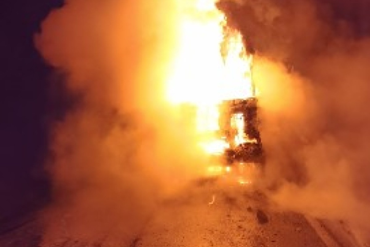 Bursa'nın Kestel ilçesinde hareket halindeyken yangın çıkan mısır yüklü TIR, alev alev yandı.