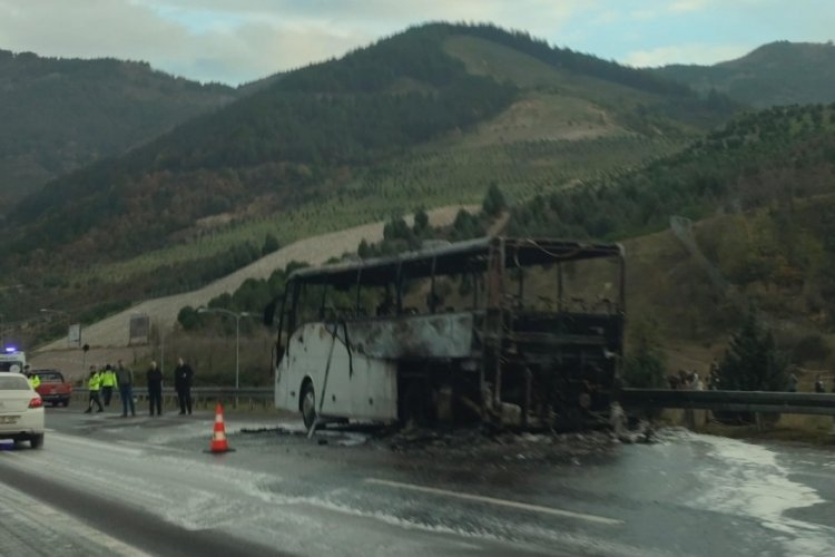 Bursa'da Gebze-Orhangazi-İzmir otoyolu Orhangazi tüneli girişinde seyir halindeki içinde 49 kişinin bulunduğu öğrenci taşıyan tur otobüsü, çıkan yangın sonucu demir yığınına döndü.