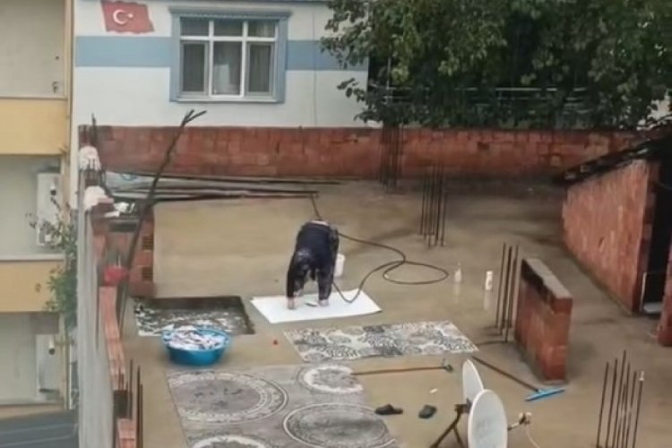Yağmurun altında çatıda halı yıkayan kadını görenler, o anları cep telefonlarıyla kaydetti.