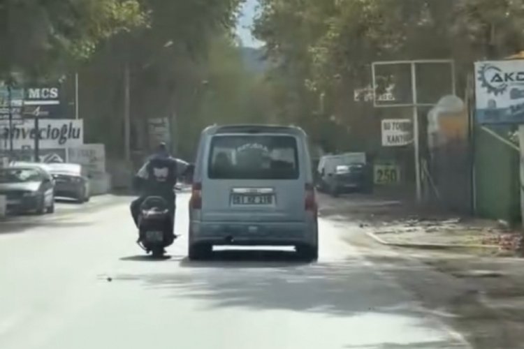 Bursa'da bir motosiklet sürücüsü seyir halindeki arkadaşıyla sohbet etmek için, bir elini seyir halindeki ticari aracın camına yasladı, diğer eliyle de motosikleti kullandı. Sürücülerin tehlikeli hareketleri kameralara yansıdı.