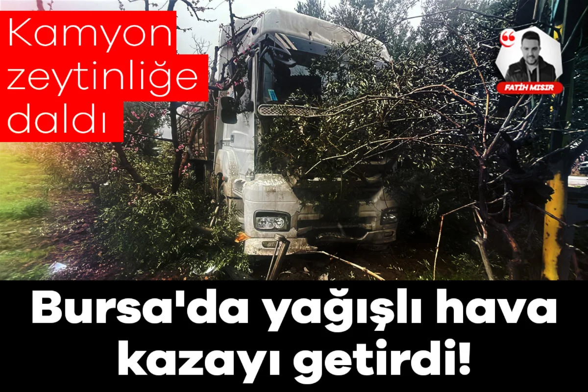 Bursa'da, Orhangazi-İznik yolunda yağışlı hava nedeniyle kontrolden çıkan kamyon zeytin tarlasına daldı. Kazada yaralanan olmazken, kamyonda ve aracın çarptığı sulama kanalında maddi hasar meydana geldi.