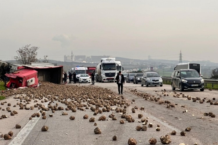 Bursa'da şeker pancarı yüklü tır kontrolden çıkıp, önce hafif ticari araca ardından kamyonete çarptı. Savrulan araçlar refüje girerken, tır devrildi. 1'i ağır 5 kişinin yaralandığı olay yerine çok sayıda sağlık ve polis ekibi sevk edildi.