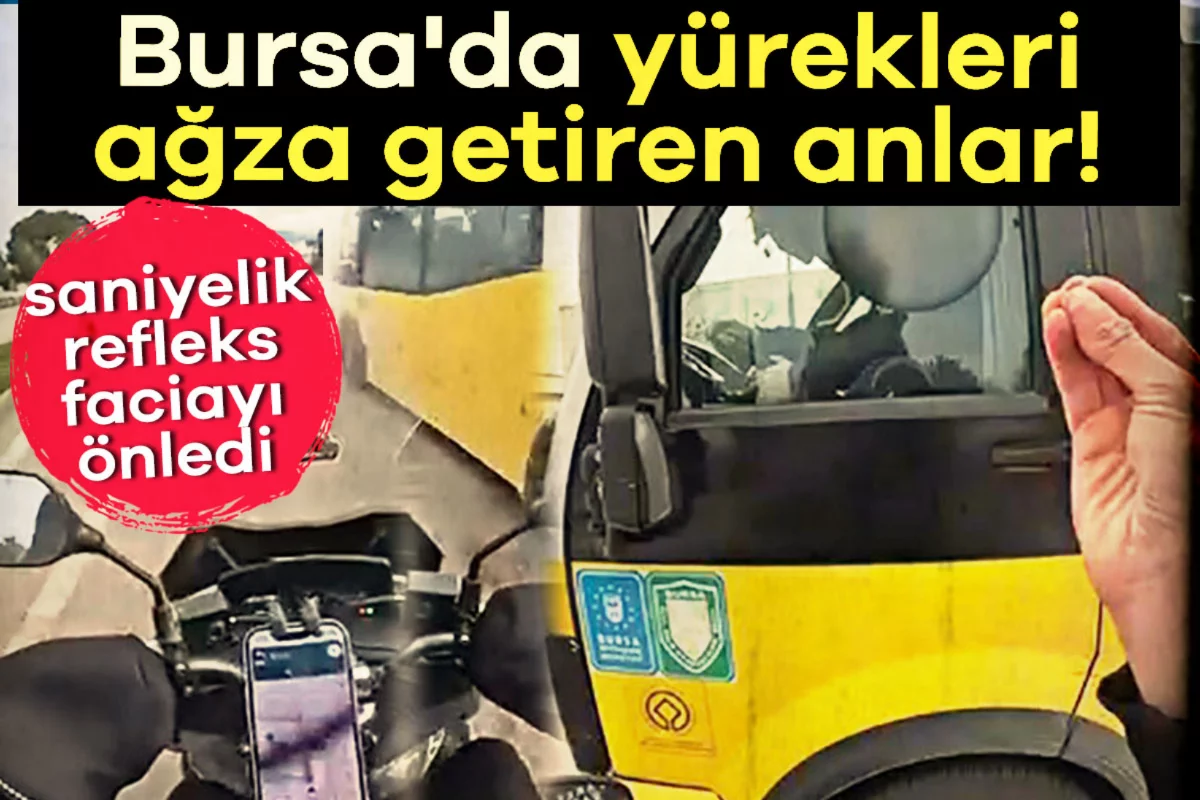 Bursa'da seyir halindeki motosiklet sürücüsü, aniden şeridine giren otobüs nedeniyle tehlike atlattı. Yaşanan gerginlik kask kamerasına saniye saniye yansıdı.