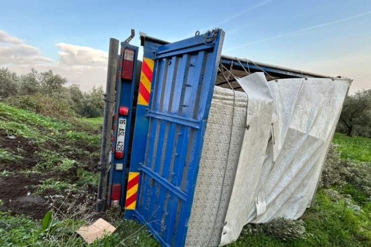 Kaza bugün ilçeye bağlı Bayırköy Mahallesi yakınlarında meydana geldi. Alınan bilgilere göre Orhangazi yönüne gitmekte olan mobilya yüklü kamyon virajda sürücünün direksiyon hakimiyetini kaybetmesi ile bir anda savrularak zeytin tarlasının içine devrildi.