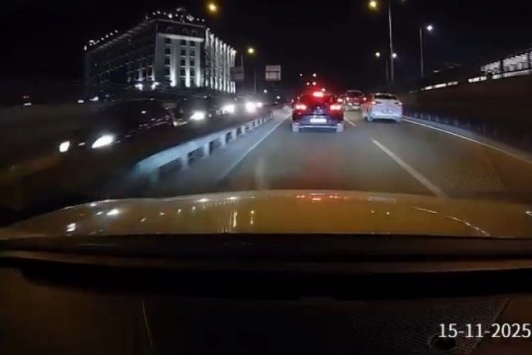 Bursa'da bir otomobil, sürücü batçıkta araçların durduğunu fark etmeyince en arkadaki otomobilin üzerine çıktı. Yaşanan zincirleme kaza, karşı şeritten gelen otomobilin araç kamerasına yansıdı.