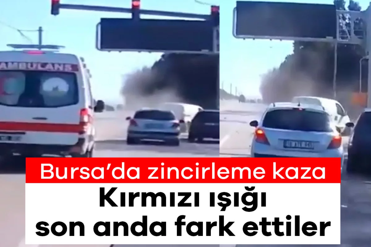 Bursa'da kırmızı ışığı son anda fark eden sürücülerin ani fren yapması zincirleme kazaya yol açtı. Kaza anı bir motosiklet sürücüsünün kask kamerasına saniye saniye yansıdı.