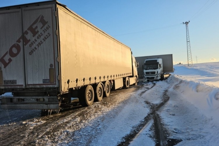 Bitlis'in Adilcevaz ilçesinde etkili olan soğuk hava nedeniyle buzlanan yolda kontrolden çıkan yabancı plakalı tır, kayarak yolu trafiğe kapattı.